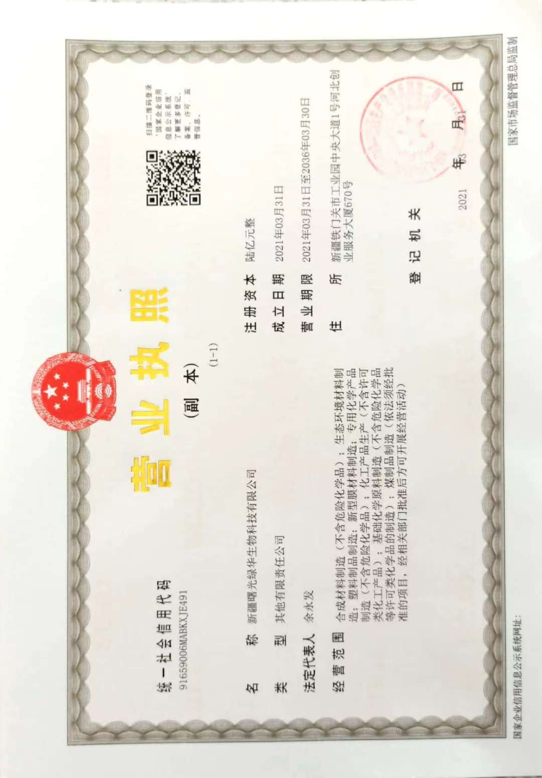 新疆曙光綠華生物科技有限公司由東華科技與安徽曙光化工集團(tuán)股份有限公司、新疆綠原國(guó)有資本投資運(yùn)營(yíng)有限公司共同設(shè)立,注冊(cè)資本金15億元,其中東華科技持股5%。經(jīng)營(yíng)范圍包括合成材料制造(不含危險(xiǎn)化學(xué)品)、生態(tài)環(huán)境材料制造、塑料制品制造、新型膜材料制造、專用化學(xué)產(chǎn)品制造(不含危險(xiǎn)化學(xué)品)、化工產(chǎn)品生產(chǎn)(不含許可類化工產(chǎn)品)、基礎(chǔ)化學(xué)原料制造(不含危險(xiǎn)化學(xué)品等許可類化學(xué)品的制造)、煤制品制造等業(yè)務(wù)。